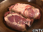 旨味が逃げないよう、脂身を外側にして巻き、サラシでくるみ、その上から木綿のタコ糸できつくしすぎないように縛り、形が崩れるのを防ぐ。 |
