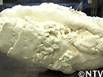 ゴム樹液にレモンを入れて混ぜ合わせ、抽出したゴムの塊を電子レンジに入れ水分を飛ばし、ローラーでゴムに箱根温泉の素を練り込んでいく。