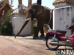 象使いのジャトーンさんの声もむなしく、バナナを食べるソムチャイ兵士。