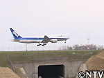 海も近くなり浜風が吹く中、目の前を通過したのはジャンボ飛行機。