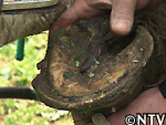 山育ちの道子は、蹄を痛めることのない環境で過ごしてきたが、 ここまでの旅で、丈夫な蹄も黄色信号。 馬にとって蹄を痛めることは致命傷。 この先、アスファルトなど固い路面を歩くことで、ヒヅメが割れたり、 欠けたりすると、歩くことさえ辛くなり、感染症の恐れもある。 そこで、足には蹄の損傷を防ぐ鉄具、蹄鉄(ていてつ)をはめる。