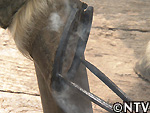 再び熱し、蹄壁の部分を溶かしながら、フィットさせる方法。 だが、熱した蹄鉄を当てた部分から煙が上がると、 煙に驚いた道子が装着を嫌がる様子を見せる。 すると、見かねた定男さんが、その広い視野を手で覆って目隠し作戦。 太一「目隠しで大人しくなった」 その間に微調整も済み、蹄壁部分への釘打ち。