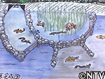 用水トンネルから流れる真水を、石垣とフェンスとで溜め、常に導く状態にし、隣に半円形のヨシの原を設け、十分な真水を留めることで安定した汽水に。 |