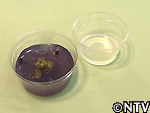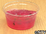 城島の説明に従い、先生方が青色のゼリーにレモンシロップをかけ混ぜあわせる。するとゼリーの色が赤く変わりはじめた。 |