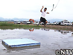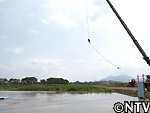 ターザンのように、クレーンで吊ったロープにつかまり、15m先、たたみ2畳分のマットに飛び移る。
