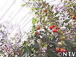 従来のビニールハウスに比べ、ピンクのフィルムを張ったハウスの方が温度が3〜4℃程低い。