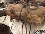 駄にロープで荷物を固定する「駄(だん)づけ」。細く急な斜面に強い道産子ならではの荷物の付け方で、運ぶ氷を固定させる。