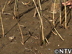 8月には、土を掘ることで、ヨシの根に栄養と酸素を行き届けてくれるカニなどが棲み着き始め、3週間後には背丈は80pを超す程に生長。コメツキガニも群れを増やしていた。 |