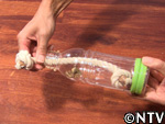 ペットボトルとロープで作った知遊玩具にクッキーを入れる。