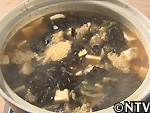 お湯でヌメリをとったゴッコの身をブツ切りにし、昆布出汁と醤油で味付け。そこへ卵、豆腐、ネギや寒ノリも入れ、ゴッコ汁の完成!
