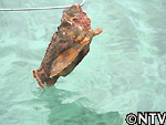 岩陰に潜む姿をなかなか見つけられない達也だったが、漁師さんに教えてもらい、ようやく発見。何とか手カギで引っ掛け、体長30cm、中ぐらいのサイズというオニダルマオコゼを捕獲!