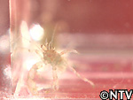 しばらく待っていると、その明かりに誘われるようにやって来たのは、生後約25日程の、ユビナガホンヤドカリのメガロパ幼生。