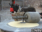 この村では、昔からロバに石臼を引かせ脱穀しているという。