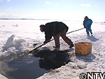 今年は6年ぶりに湖面が全面凍結し、もう一つの伝統漁、ワカサギやシラウオを網で追う「氷下曵き漁」は40年ぶりに行われた。 |