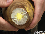 さらに、熱が通りやすいように先端を切り落とし、後で皮をむきやすいように切り込みを入れる。掘りたてはアクが少ないので水だけで煮ても大丈夫だが、一般家庭では、米ぬかや米のとぎ汁など、アルカリ性の水で煮ることでえぐみ成分を取り除くことができる。 |