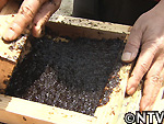 海苔枡1杯分の海苔切りしたノリをすくい取り、木の枠へ均等になるように流し込む。 |