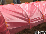 ピンクのネットとフィルムは、太陽光を植物の光合成に有効な波長域に変換する特殊素材。ハウスとして使用すれば、早期収穫、収量増加、さらに糖度増加が見込める最新農業技術。