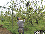 悪い虫もいる一方で、美味しいさくらんぼづくりを手伝ってくれるのが、セイヨウミツバチ。しかし、寒い日だと活動しないため、ダチョウの毛でできた授粉用毛バタキも使う。