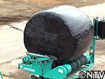 リモコンのスタートボタンを押すと、ラッブが牧草の周りを回り、牧草をラッピングしていく。