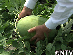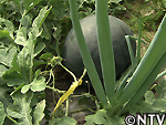 ネギの根についている微生物がスイカの病気を防ぐため、スイカの根本には一緒にネギを植えるという。 |