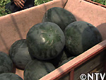 早速、運搬車にスイカを積み込んで行くが、「おつきさまスイカ」は1個平均8kgもあり、なかなかの重労働。 |