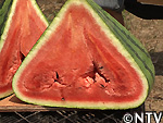 名付けてピラミッドスイカ。まだ実が出来始めのときにこの型に入れて育てたピラミッド型のスイカ。京橋千疋屋では、観賞用として店頭に並び、参考価格26,250円!
