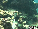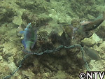 狙う群れを発見すると、石を網の反対側へ投げ、網の方へ移動する魚を、激しい泳ぎで追い込んでいく!