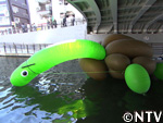 スカイツリーを目前に、橋の上から亀次郎を放流!