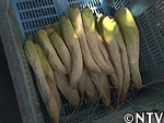 3週間程干した千都大根(青首大根)とたくあん用の干し理想大根の2種類を、葉を切り離しながら取り込む。