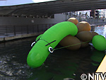 何とかしがみつきながら、オールで漕いで進むも、東京湾にたどり着く前に、巨大バルーンは跡形もなくしぼんだ。 |