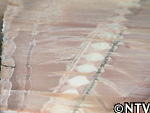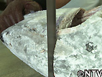 続いて、長瀬以上にビビッている達也が挑むが、エラの穴の中央部分を切断してしまい、おいしい身の部分をかなり無駄にしてしまった…。 |