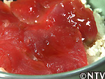 スプーンで身を削り取り、ご飯の上にのせ、特製のタレをぶっかけて、三崎加工場のまかない飯「中落ち丼」が完成。