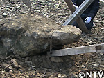 推定800kgの岩、初めは5人がかり10人分の力で持ち上げる。