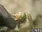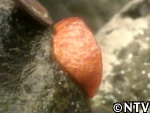 調子に乗って、次から次へと石をひっくり返していると、石にくっ付くプルプルした緑色の物体が。