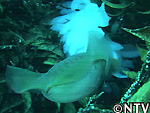 イカたちが警戒しているのは、枝の中に潜んでいた巨大なウツボ。