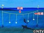 幹縄と呼ばれる1本の縄に、エサを付けた枝縄を5本から10本ほど垂らして仕掛けておき、翌日引き上げる。