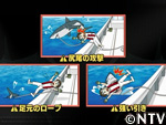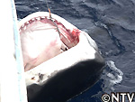 だが、この巨体をそのまま甲板に上げてしまうと、暴れて襲われることもあるので、サメの推進力となる尻尾をワイヤーでしっかりと縛り、船の後ろにくくりつける。 |