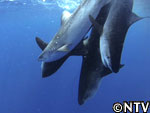 達也が必死にサメと格闘!城島は、もう一度、くくりつけ作業に挑む! |