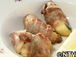 短冊に切った桃を大葉でくるみ、さらに豚バラ肉で巻く。 |