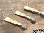 テンヤとは、竹の板の両端に、重りとカエシのない針をつけた仕掛けのことで、タコがカニに食いついてきたら、針で引っかけて引き上げる。