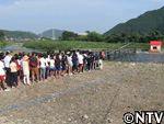 しかし100人で息を合わせて、勢いよくスポンジを押し入れると、力が加わった所から順に、竹筒の横から水が勢いよく漏れた!