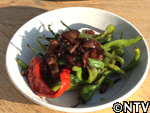 一方、松岡は、伏見とうがらしと地鶏の燻製の切れ端を一緒に炒める。