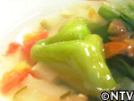 この野菜のダシが効いたあんを、先ほど冷やしておいた九条ネギにかけて、2品目の『九条ネギの万願寺とうがらし入りあんかけ』の出来上がり。