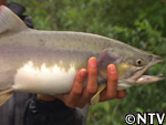 一方、リールなしの竿一本の伝統漁法「てんから釣り」で巨大ニジマスを狙う長瀬。