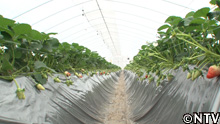 こちらでは、イチゴを甘く大きくするため、ひと枝に5つ以上実が付いたら6つ目を摘果する。