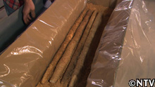 収穫した自然薯は、泥を落とし、乾燥させた後、おがくずを敷いた段ボールに入れる。こうする事によって、2℃に設定された冷蔵庫に保管しておけば、年間を通して出荷する事ができる。 |