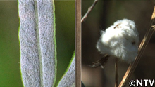 植物に虫が寄生すると、その部分に「虫こぶ」という塊ができるが、ヨモギの場合、茎にヨモギワタタマバエが寄生すると、ヨモギがそれに刺激され、葉の裏に生えている毛と同じ繊維でこぶを作り、虫が寄生した部分をくるんでしまう。 |