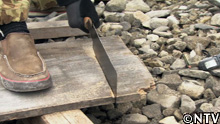 まず、浜で拾ってきた幅も厚さもまちまちの板を、舟屋に必要な長さ、179cmに切り揃えていく。
