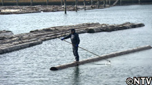 と、その先には海に浮かぶ丸太の上に乗っている人の姿。