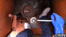 この巨大な丸太、切る道具も規格外で、刃の長さ1.8m、重さ100kgの巨大なチェーンソー“デッキソー"。